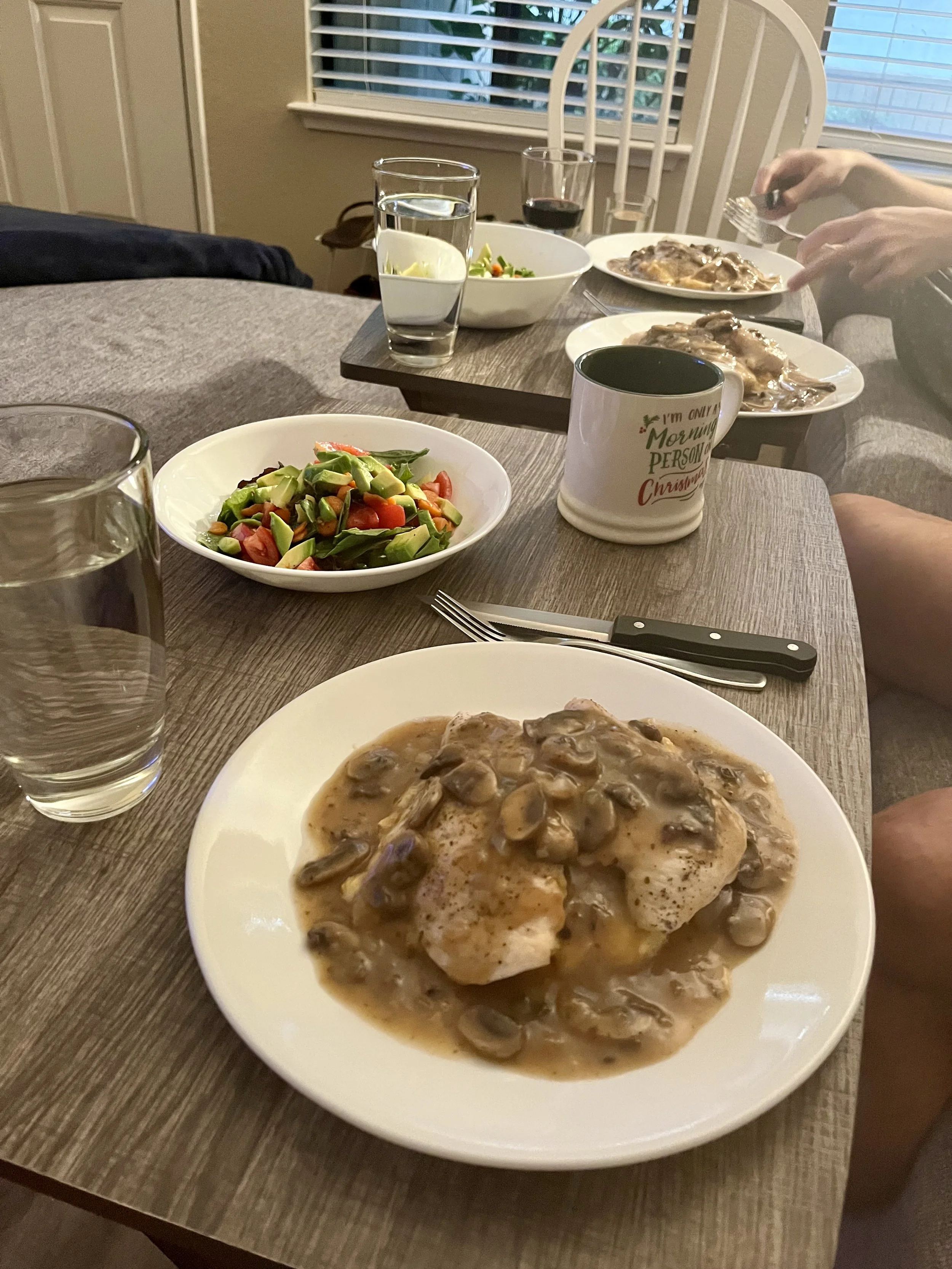 You can eat this served with pasta, rice, or mashed potatoes if you’d like… we usually eat it by itself with a vegetable on the side